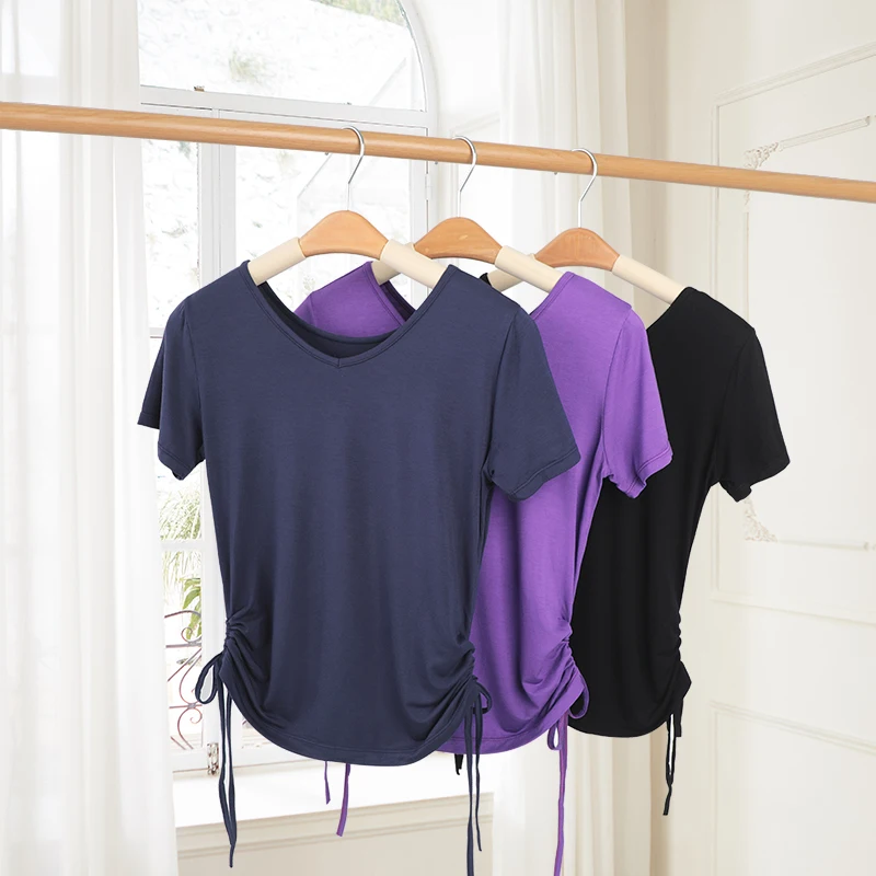 Adult Ballet Drawstring Tops Modal Short Sleeve V Neck Tops Dance T-shirt Woman Dancewear Training Suit